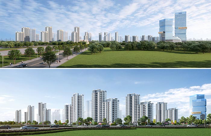 項目總規(guī)劃用地1405畝,包含住宅、商業(yè)、教育、醫(yī)療、公園綠地等13類用地,其中,公建用地規(guī)劃于中心區(qū)域,沿環(huán)城水系兩岸,形成兩大服務設施中心,住宅呈環(huán)抱姿態(tài)分布于配套周圍。本次匯報范圍是東京北回遷區(qū)域首開區(qū)與二期地塊。項目規(guī)劃總建筑面積約74萬平方米,其中地上建筑面積約52萬平方米,地下建筑面積約22萬平方米,規(guī)劃設計49棟住宅樓,兩所中小學,兩所幼兒園,一座商業(yè)綜合體,其他各項指標均符合規(guī)劃要求。
