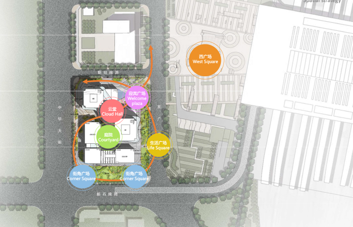 南側企業(yè)總部以L型高低錯落布局呼應塔樓形態(tài),創(chuàng)建公園式辦公組群,有機銜接場地周邊綠地景觀,營造活力多樣化的景觀空間。中華大街沿線結合周邊組團,形成層次豐富、舒緩延展的優(yōu)美天際線。