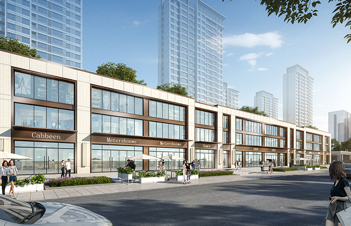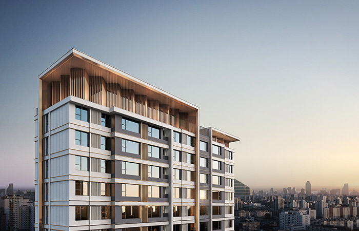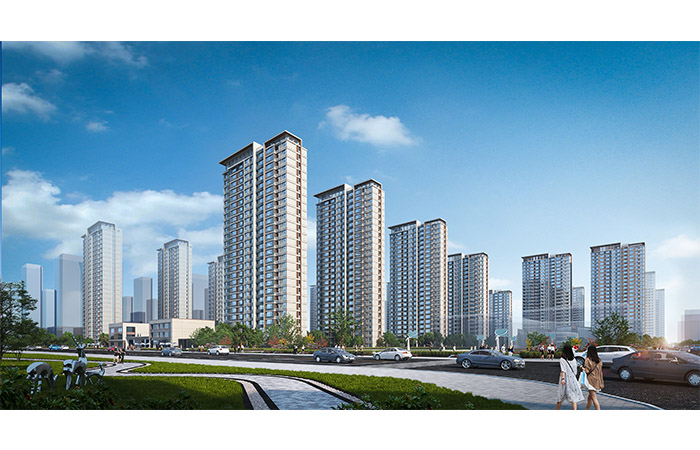 住宅立面采用簡潔的水平線條與挺拔豎向線條形成對比,打造經(jīng)典、簡約的立面風(fēng)格。在近人尺度部位、檐口、頂部造型等,采用金屬鋁板、金屬線條等高品質(zhì)材料打造。建筑色彩分區(qū)規(guī)劃,結(jié)合低彩度、高明度的米白、淺灰、淺咖等色彩,整體形成豐富有序的城市界面。