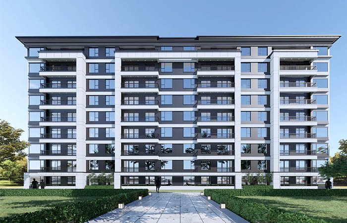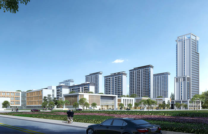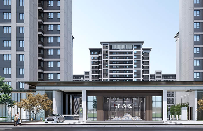 建筑風格為新中式與現代建筑混合,既與周邊建筑風格相協調,又體現獨創(chuàng)和完美意境。建筑顏色主要由灰色和米色構成,立面設計,優(yōu)雅大氣,富有格調。