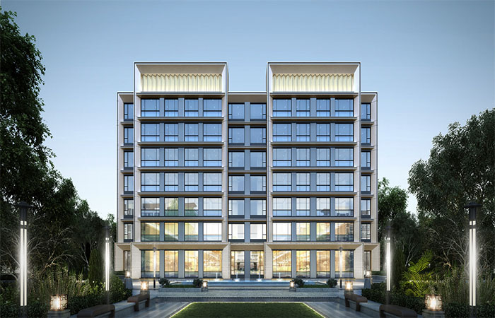 建筑立面造型化零為整,采用米黃色與深灰色作為建筑主色調(diào),簡(jiǎn)化瑣碎的線腳裝飾,呈現(xiàn)建筑公建化的穩(wěn)重氣質(zhì)。采用大尺度的豎向線條,整合建筑形象,強(qiáng)化建筑明確的符號(hào)特征,沿中山路形成明確的標(biāo)識(shí)性和宏大的公建感體量。