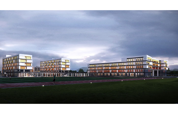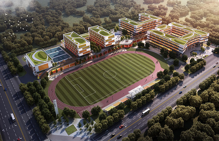 學(xué)校外立面隱喻書海,像許多本書堆疊在一起,形成書海綠洲;校園東側(cè)擁有大片綠海,便于學(xué)生親近自然,擁抱綠色,形成學(xué)習(xí)森林。中部風(fēng)雨連廊首層架空,結(jié)合中部觀景平臺提供給學(xué)生更多的共享灰空間;北側(cè)風(fēng)雨操場、學(xué)生宿舍與南側(cè)教學(xué)樓、綜合樓通過連廊成為一個建筑整體,結(jié)合西側(cè)操場和東側(cè)生態(tài)園形成立體樂園。最終創(chuàng)造一所混合性、體驗性、人文性和生態(tài)性多功能細(xì)化互融的新型學(xué)校。