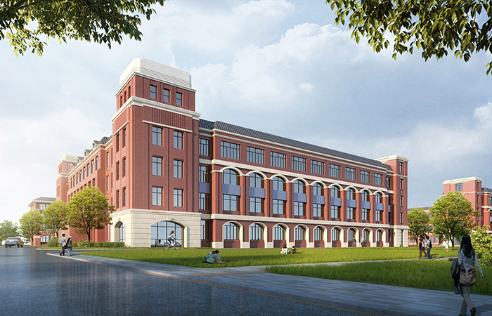 建筑外墻采用磚紅色與米白色相互碰撞映襯,形成典雅靈動(dòng)的視覺(jué)對(duì)比,以仿石漆、石材、Low-E中空玻璃為主要裝飾材料,突出建筑精工細(xì)作、開(kāi)拓創(chuàng)新的工匠精神。
