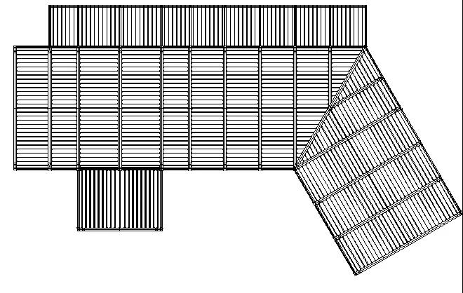 整個結構形式:豎向承重構件為實木柱,水平傳力構件為實木梁,屋面板為擱柵加木基板。水平向的實木梁將單榀木桁架連在一起,外側實木柱加柱間斜撐,屋蓋為擱柵加木基板,確保了抗側剛度和平面外穩(wěn)定性。