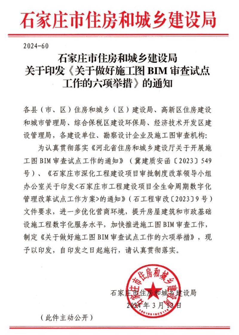 繼2023年12月7日河北省住房和城鄉(xiāng)建設(shè)廳發(fā)布《關(guān)于開展施工圖BIM審查試點(diǎn)工作》的通知,2024年3月13日石家莊市住房和城鄉(xiāng)建設(shè)局印發(fā)了《關(guān)于做好施工圖BIM審查十點(diǎn)工作的六項舉措》的通知,其中第一項舉措就提到了“自2024年4月1日起取得建筑工程規(guī)劃許可證的超高層建筑及政府投資公共建筑、城市綜合管廊、軌道交通項目須進(jìn)行施工圖BIM審查,建設(shè)單位及勘察設(shè)計企業(yè)應(yīng)登錄河北省施工圖數(shù)字化聯(lián)合審查系統(tǒng)進(jìn)行BIM 審查項目申報,并提交BIM 設(shè)計成果!
